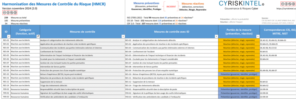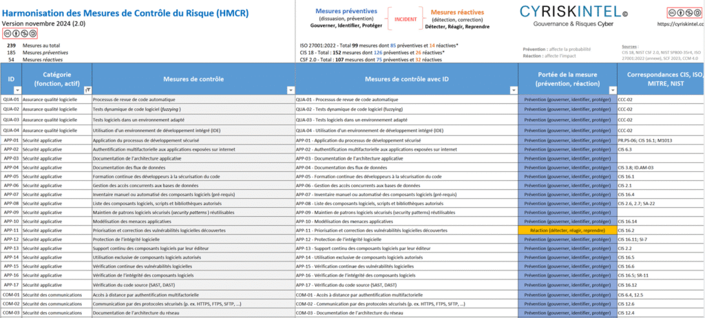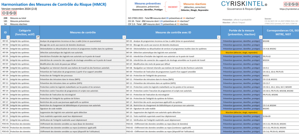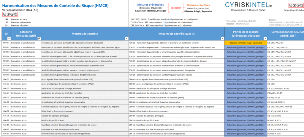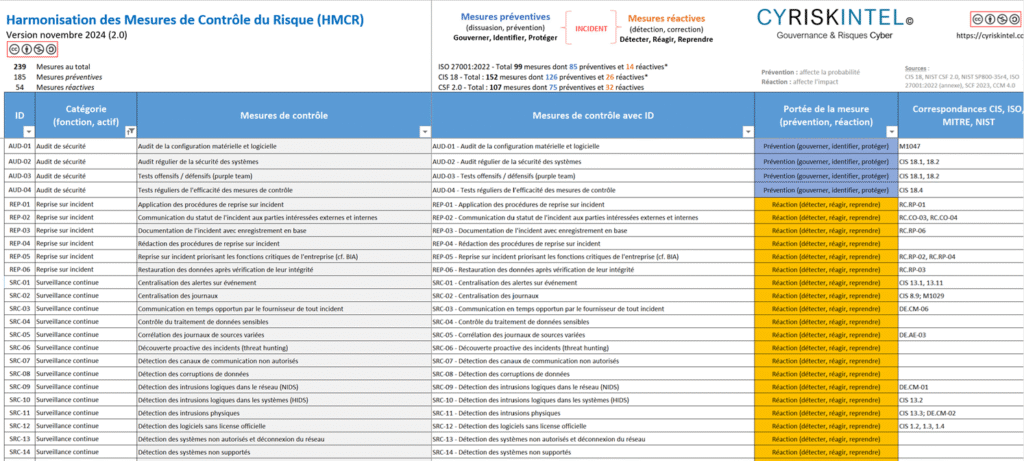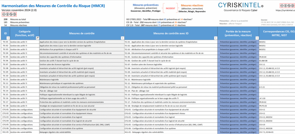 Dans le cadre de l’offre CYRISK-R, nous avons développé notre propre référentiel de mesures harmonisé associé aux référentiels externes (ISO, NIST CSF 2.0, CIS 18, Mitigations Att&ck, etc.). Au total 267 mesures qui couvrent la plupart des aspects fonctionnels de sécurité.