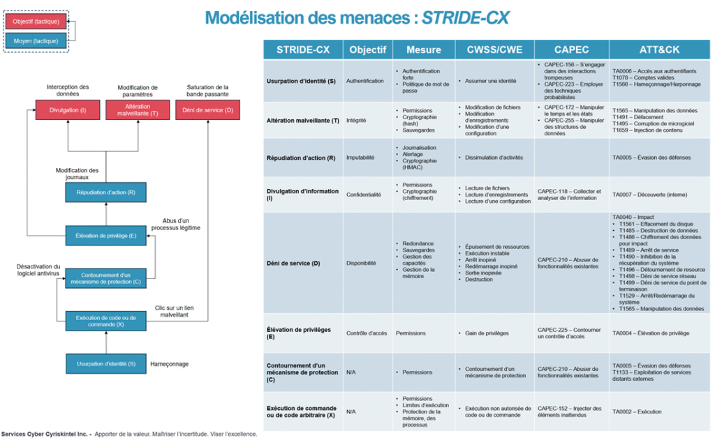 Aux STRIDE traditionnels, on ajoute le Contournement d’un mécanisme de protection (C) et l’Exécution de code ou de commande arbitraires (X).